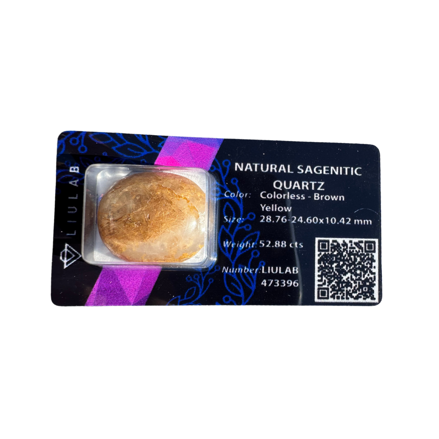 This stunning Natural Sagenitic Quartz features captivating golden-brown needle-like inclusions, creating a web-like pattern inside a luminous, colorless-to-yellow stone. A certified round cabochon, ideal for luxury jewelry design or gemstone collecting.